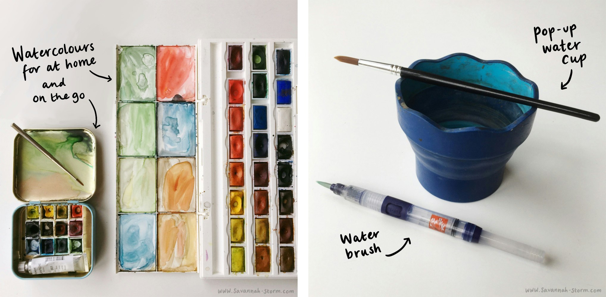 I love watercolours, my old reliable set I use at home is a Windsor and Newton 24 pan set. I usually prefer quick sketches so mostly go for pans over tubes. Depending on how much stuff I want to carry when sketching outside I'll either use a paintbrush and my pop-up water cup (it's a bit battered now but one of the most useful purchases ever!) or just a water brush for really quick washes.