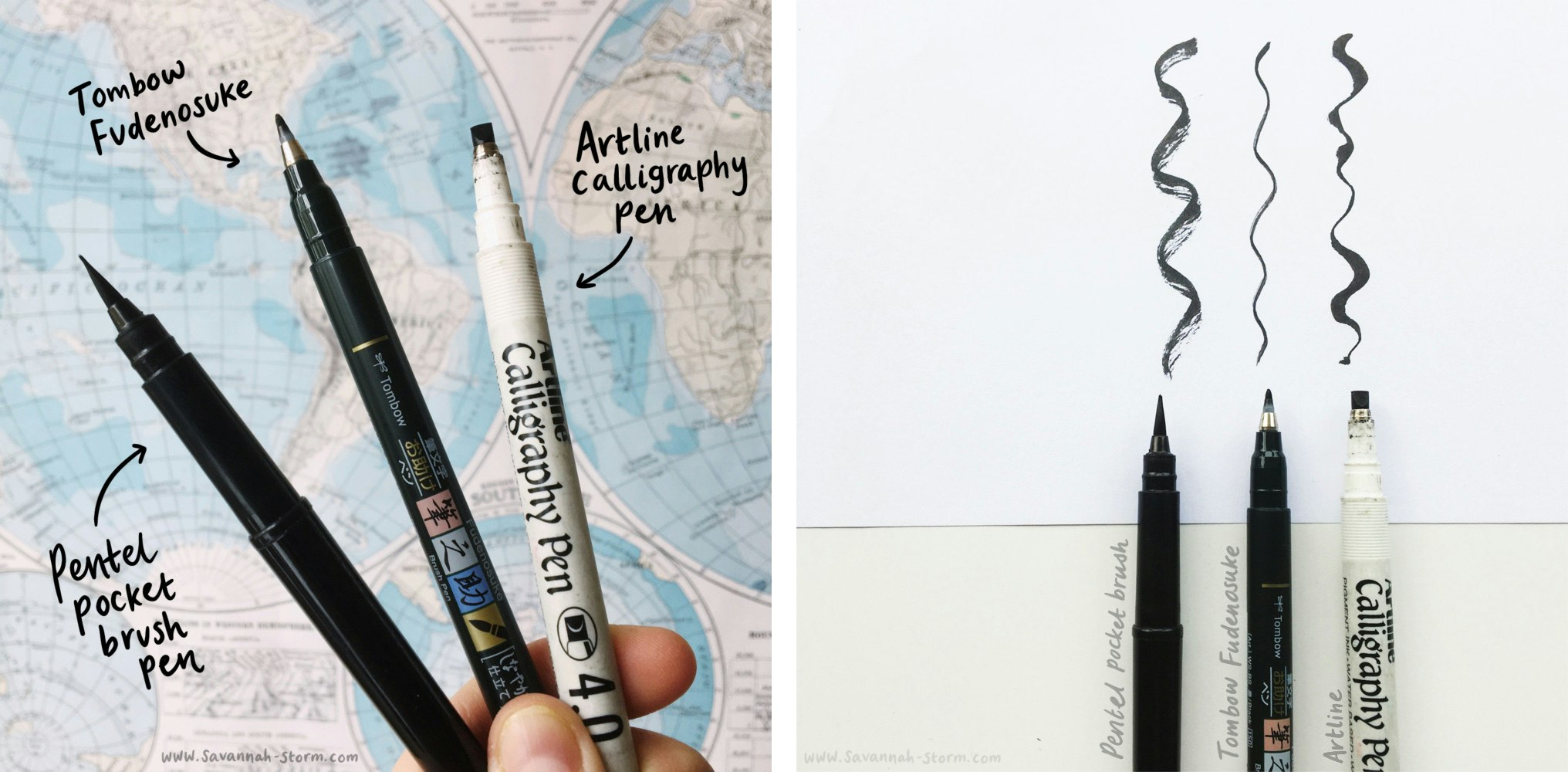 I usually go for waterproof ink pens so I can add watercolour paint washes over the top of line drawings. These are my top 3 at the moment: Pentel pocket brush, Tombow Fudenosuke and Artline Calligraphy pen - I do like a calligraphy pen for different weights of line. I've also recently got a Sailor fountain pen with a bent nib for sketching, so you can get thicker and thinner lines with that too.